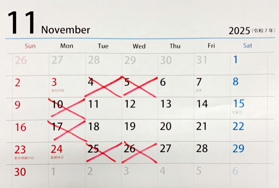 さて、11月の営業日のお知らせです。